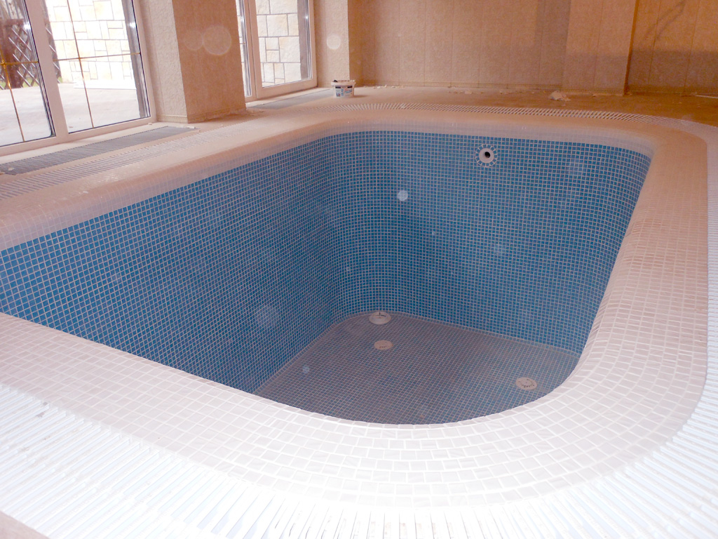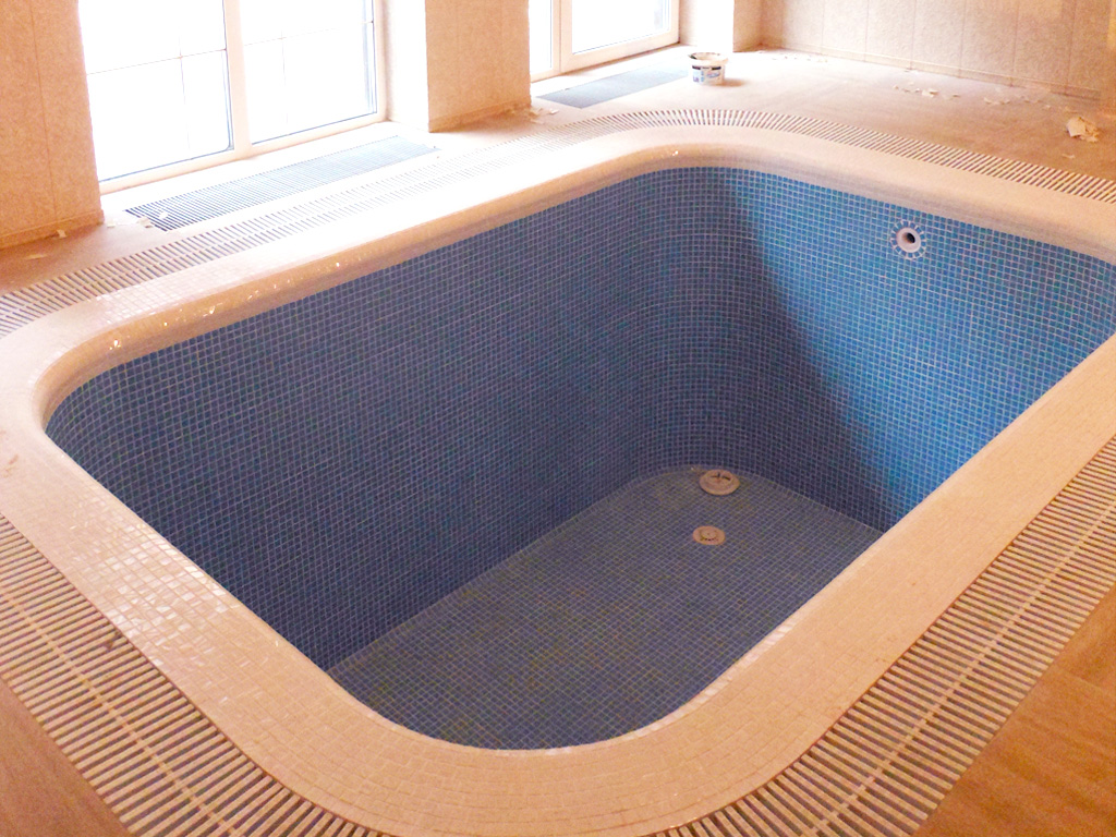 Частный бетонный переливной бассейн 4х6х1,8 в городе Красногорск, Московской области. Выполненые работы: заливка чаши; гидроизоляционные работы; отделка стеклянной мозаикой; произведен монтаж фильтровального и оборудования системы дозации; а также блоков управления.